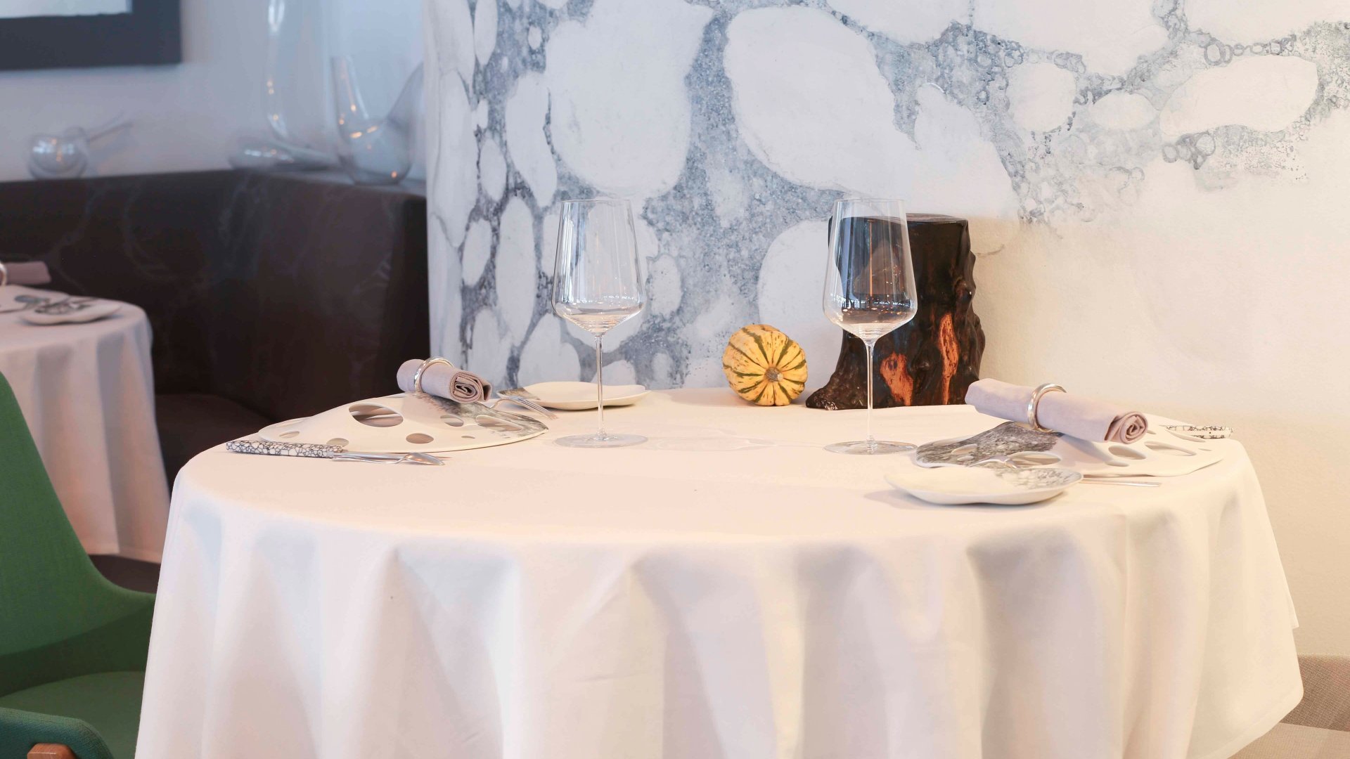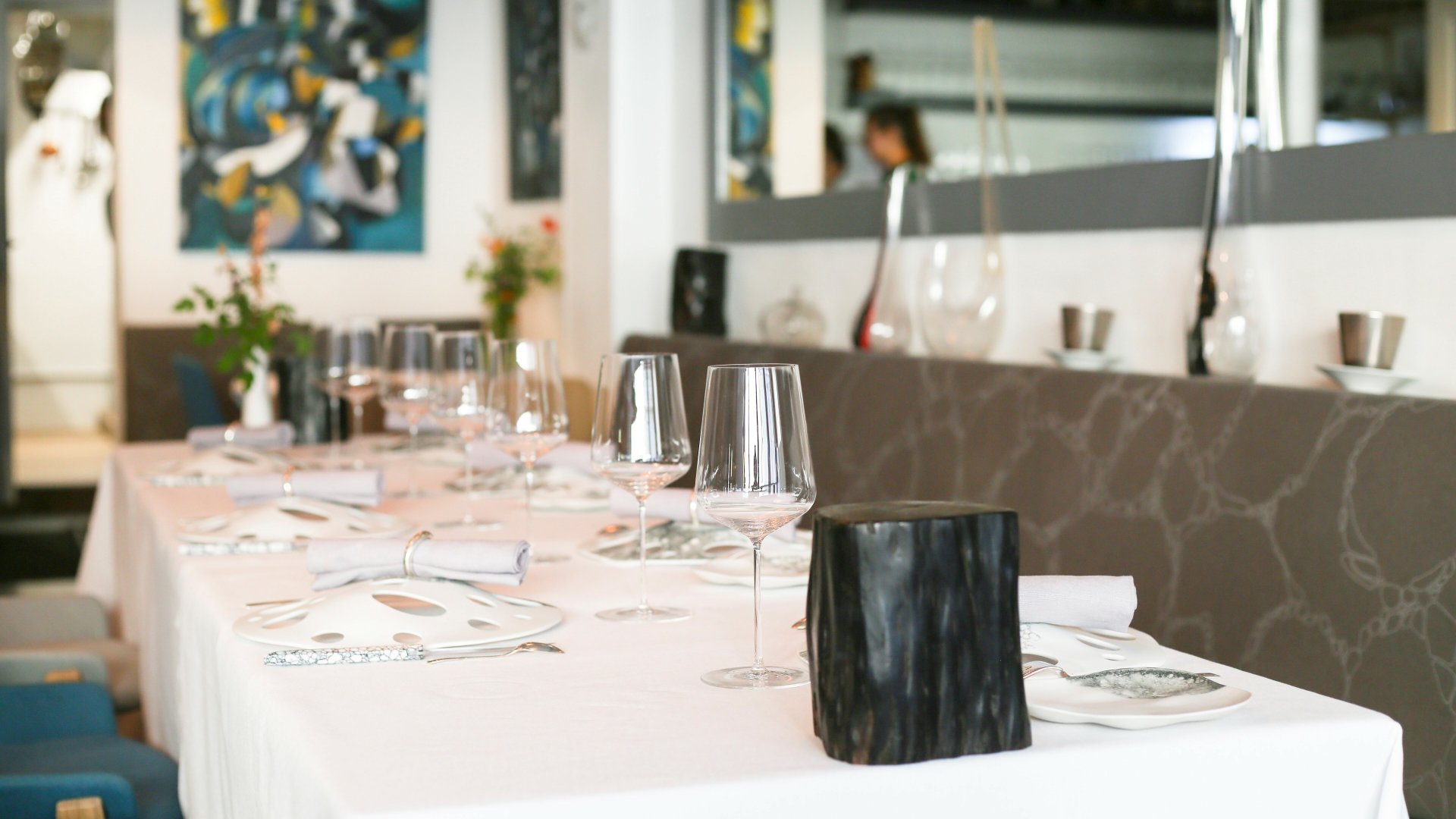 Dans un décor inspiré par les mouvements de l’écume, objets d’art, sculptures et peintures modernes ponctuent avec justesse et raffinement le lieu où le gris perle s’harmonise avec un Art de la Table créé sur-mesure.